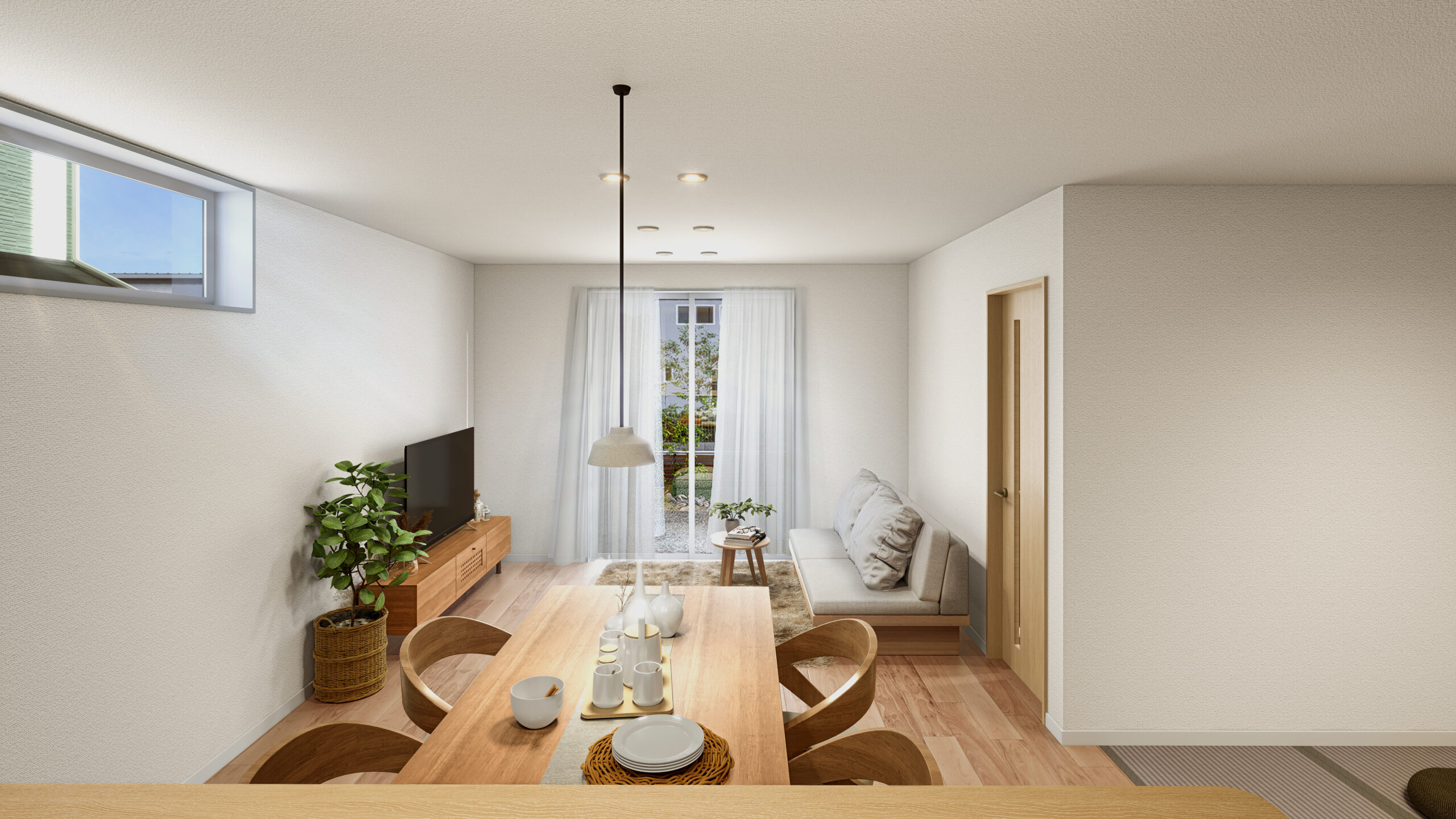 1階は20畳超え。16畳の広々LDKに4.5畳の和室・押し入れつき。対面キッチンで家族の会話も弾みます♪