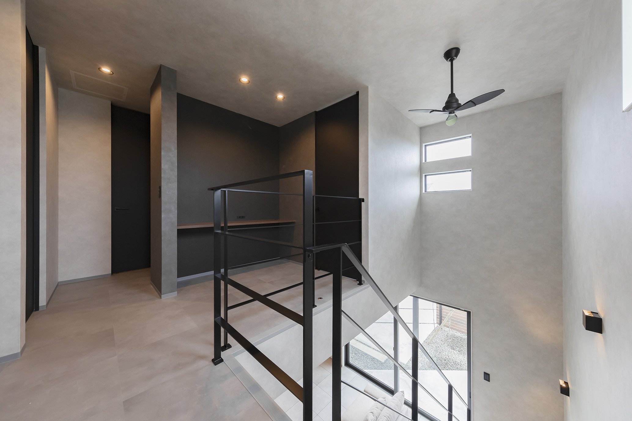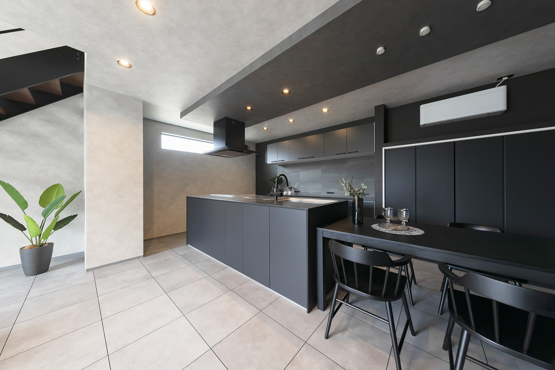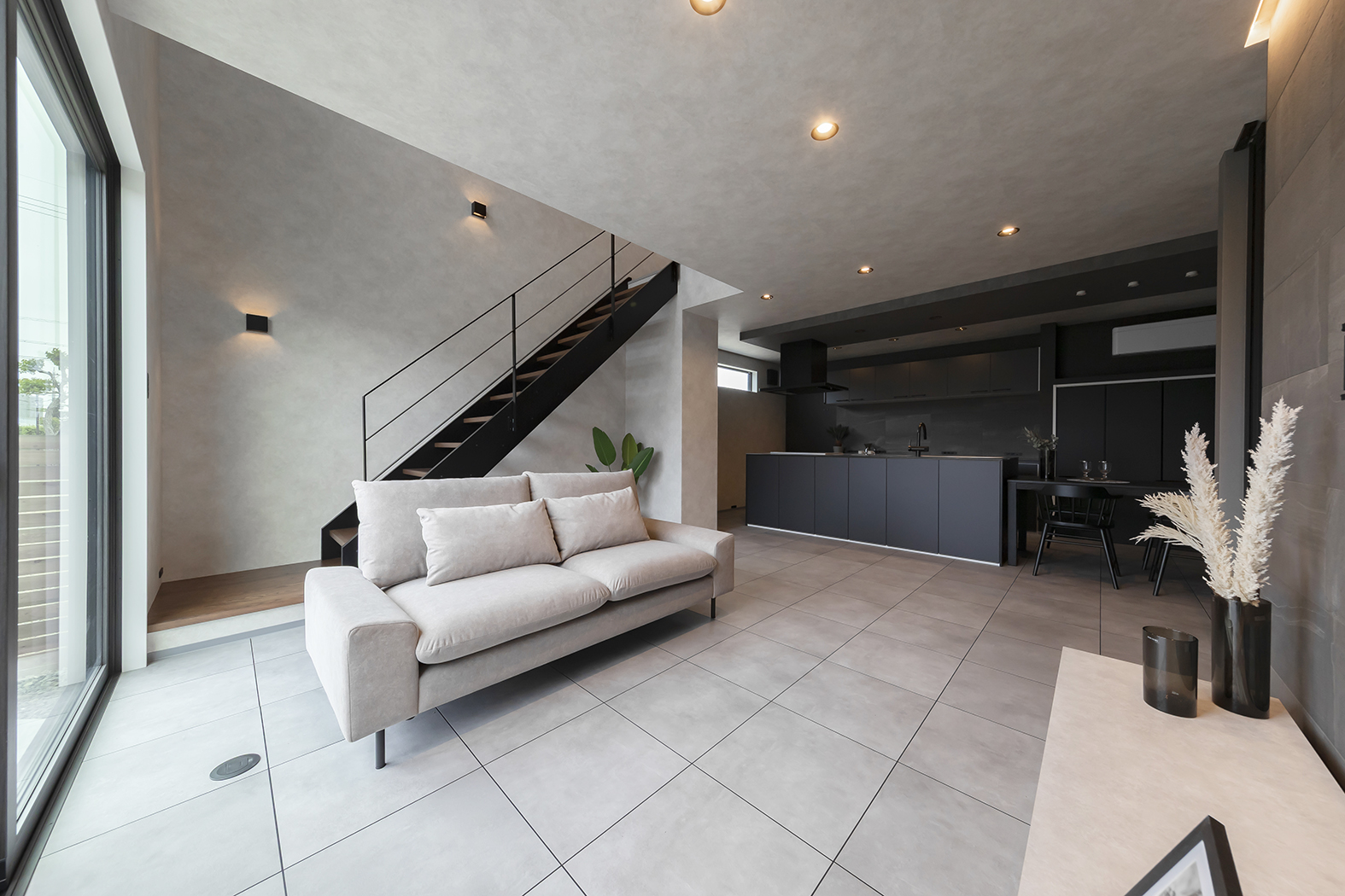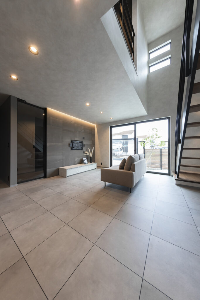黒×グレーを基調に、タイル貼りの床+スケルトン階段がスタイリッシュな空間を演出