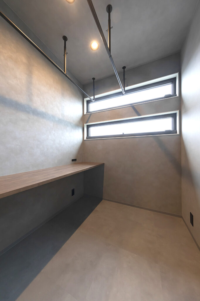 干す⇒畳むがその場で完結。高窓×2本の物干しバー×長尺カウンターが毎日の家事を手助け。