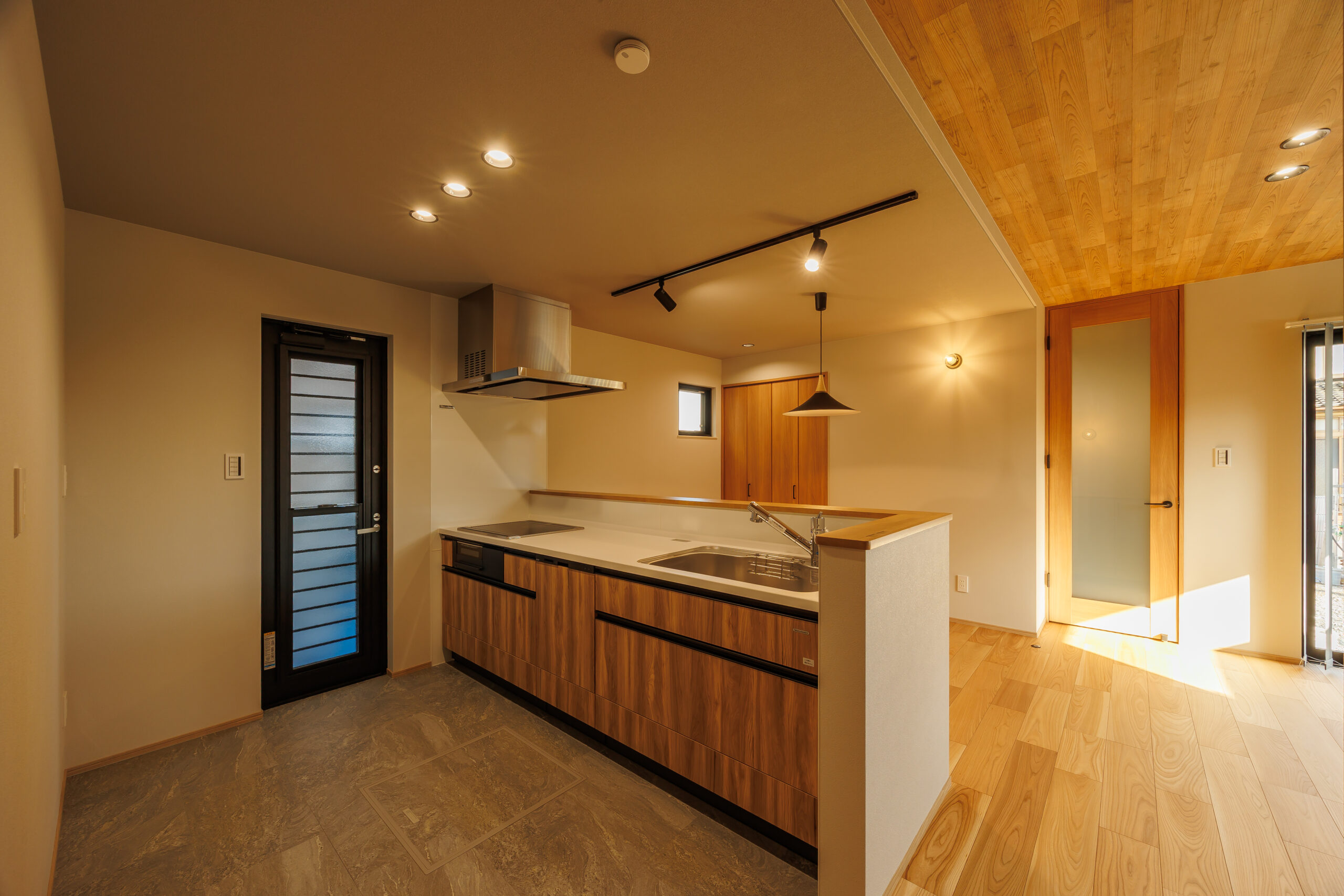 レールライトとペンダントライトを組み合わせた照明計画で、手元を明るく照らしながら、夜は食卓をやわらかく包みます。