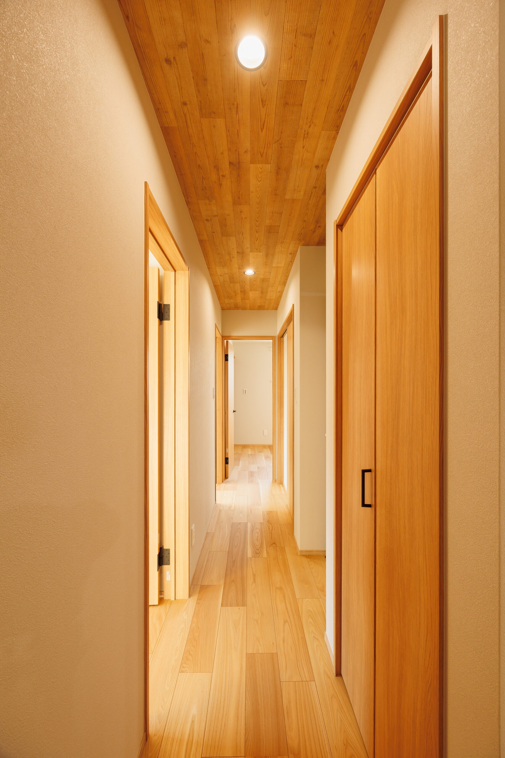 木天井はリビングだけでなく、廊下にまで続きます。階段のない一階完結の間取りは、小さなお子さんからご高齢の方まで、家族みんなが安心して暮らせる設計です。
