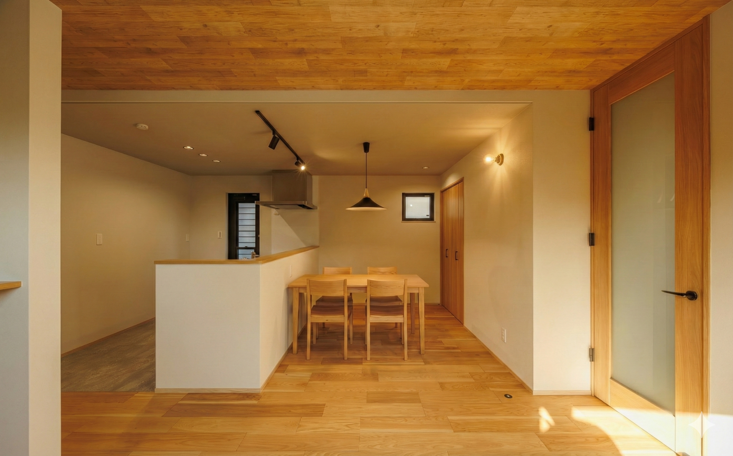 LDKから廊下、水まわりまで、天井一面に木を張り巡らせたこの家の最大の特徴。