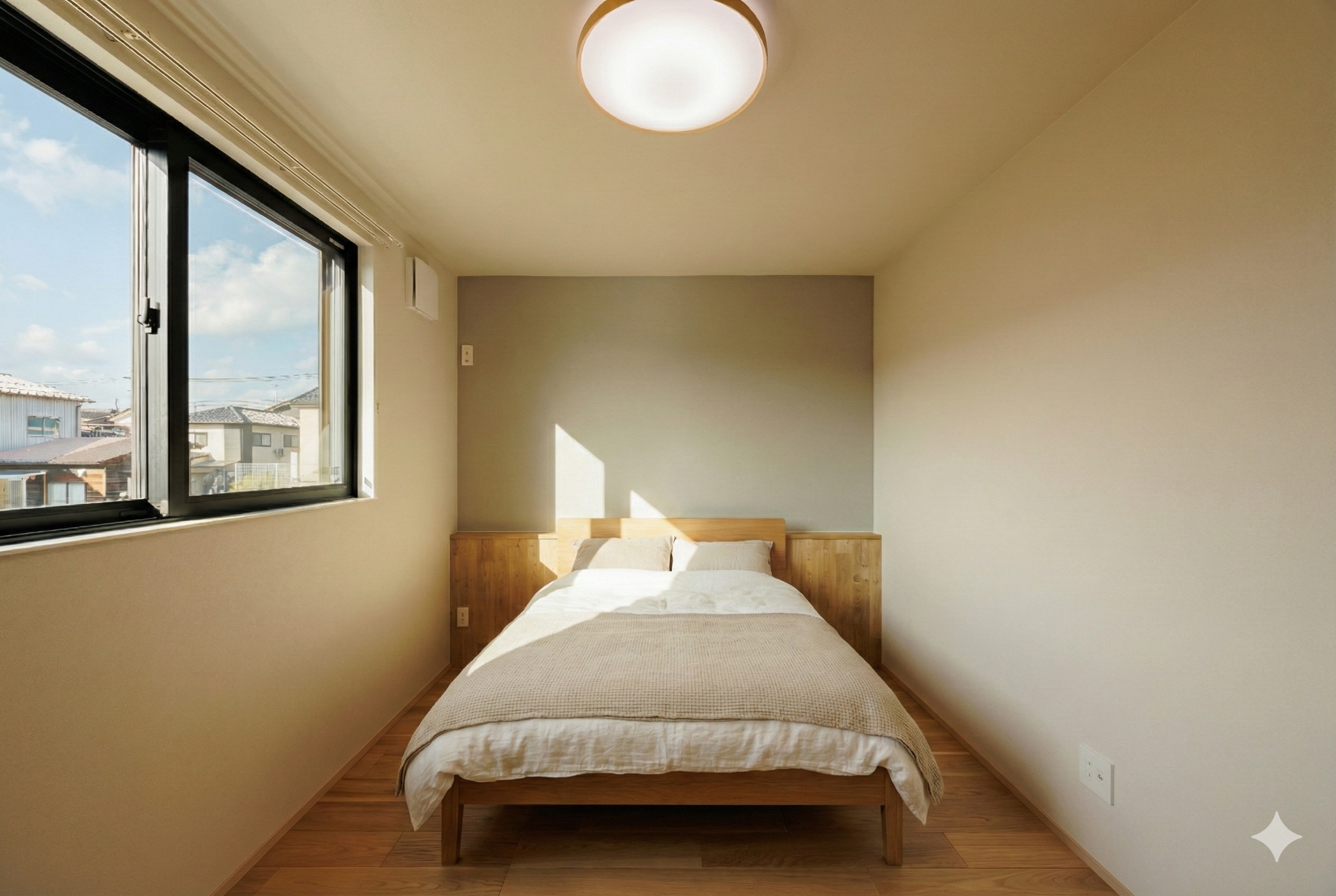 余計なものを省いたシンプルな内装だからこそ、ナチュラルウッドのベッドフレームや床の質感が際立ちます。一日の疲れをしっかりリセットできる、プライベートな空間です。