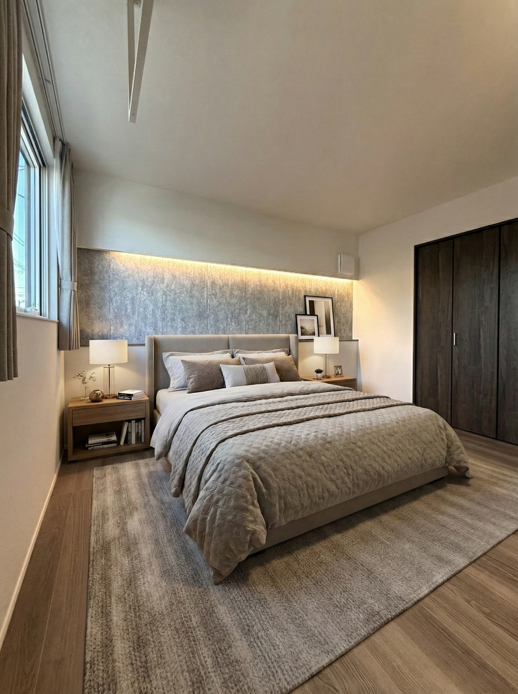 一日の疲れをリセットしてくれる主寝室は、テクスチャーのあるアクセントクロスとベッドヘッドの間接照明が特徴的。トーンを統一したニュートラルカラーで、目に優しく落ち着いた雰囲気を演出しています。