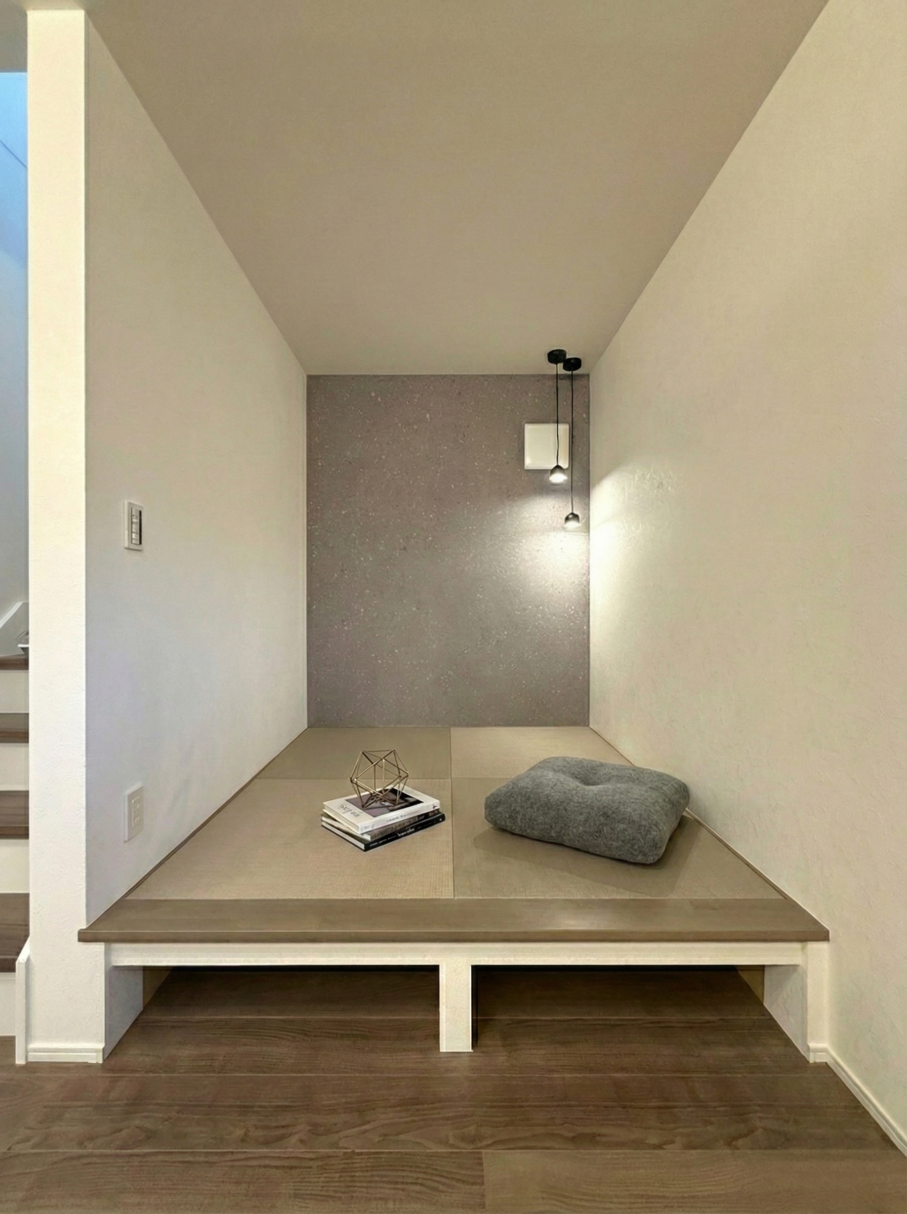 リビングの一角に設けた畳コーナーは、子どもの昼寝場所にも、大人の読書スペースにも。グレーのテクスチャーアクセントウォールとペンダントライトが、和の空間をモダンにアップデートしています。